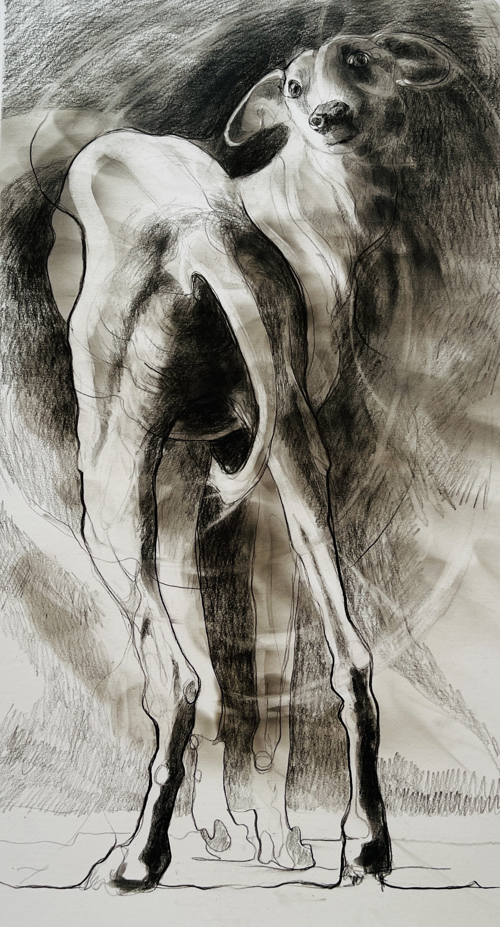 The title “Smoky Hounds and Inky Chicks” offers a playful yet textured entry into Clark’s exploration of form and process. The “smoky” and “inky” reference materials and techniques that underpin the body of work — smoke, soot, charcoal, ink — while “hounds” and “chicks” evoke whimsical, semi-figurative creatures.