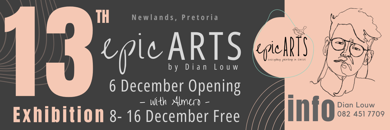 It's an honour to invite you to our 13th epicARTS Christmas Exhibition '25! The success of our exhibitions is something I could not have dreamed about, but how thankful am I for all your support and how lucky am I to showcase my work alongside 20 super talented Gauteng-based artists! All art on display will be for sale directly from the artists making it extremely affordable. There will be a Coffee corner to keep our hands and hearts warm. Come and enjoy this weekend of art with friends and loved ones for our 13th epicARTS Christmas Exhibition like no other for that special gift or just to spoil yourself!