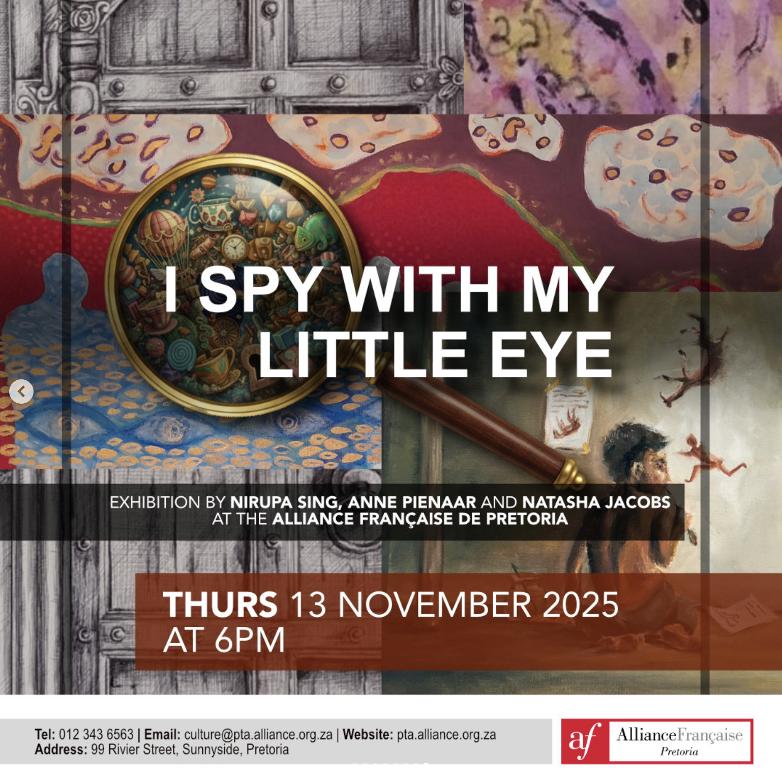 We are delighted to invite you to the opening of "I Spy With My Little Eye", an evocative group show featuring three talented South African artists:- Nirupa Sing presenting expressive mixed- media paintings that explore symbolic depths and human connection.