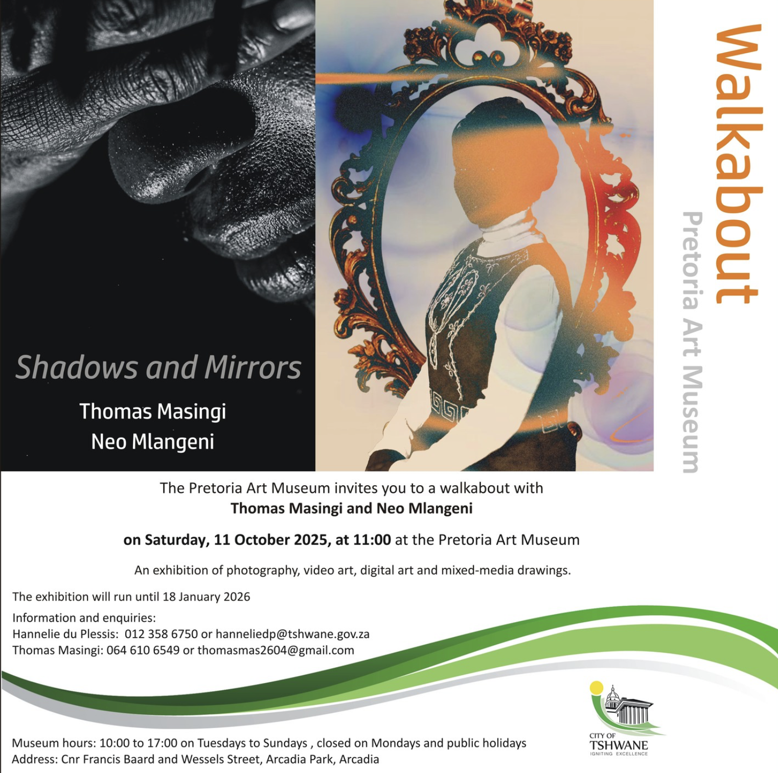 The Pretoria Art Museum invites you to a walkabout with Thomas Masingi and Neo Mlangeni. An exhibition of photography, video art, digital art and mixed media drawingsDate: Opening on Saturday 11 October 2025 at 11h00 Opening Times: