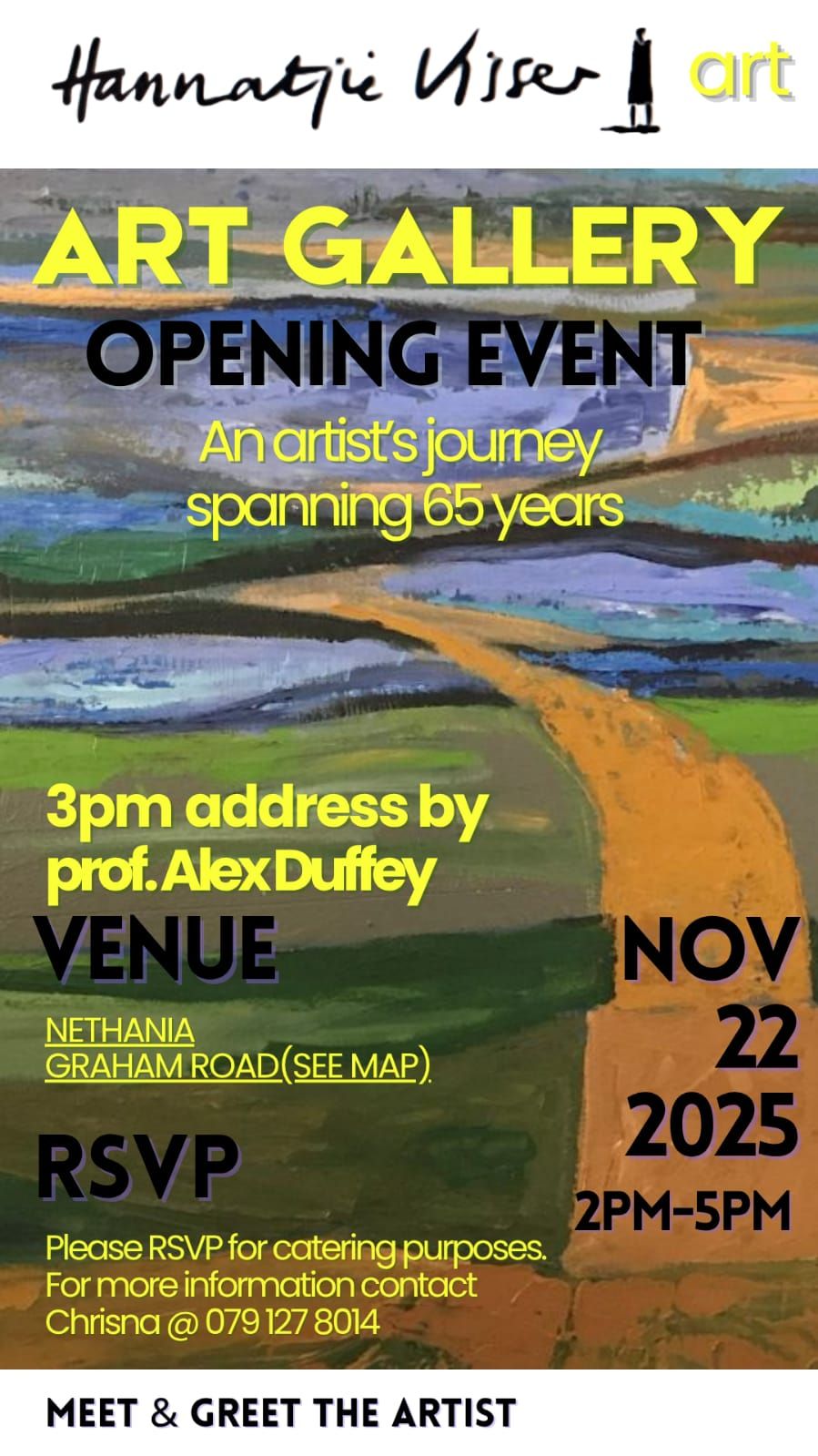 Come and enjoy a lovely afternoon with us, listening to Prof. Alex Duffey at 3pm unpacking Hannetjie Visser's art journey from an art historian’s point of view. Save the date and please RSVP. We are looking forward to seeing you there.Date: 22 November 2025, 2 - 5 PM