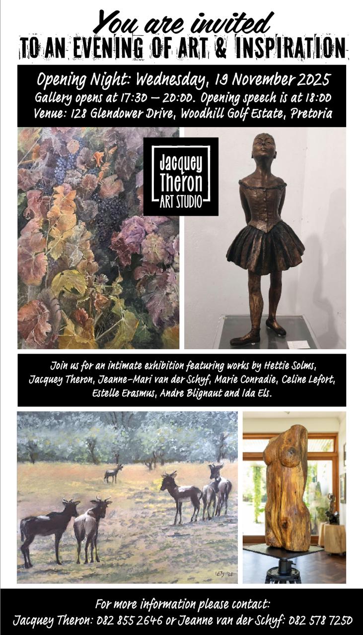 Join us for an intimate exhibition featuring works by Hettie Solms, Jacquey Theron, Jeanne-Marie van der Schyf, Marie Conradie, Celine Lefort, Estelle Erasmus, Andre Blignaut and Ida Els.Date: 19 November 2025